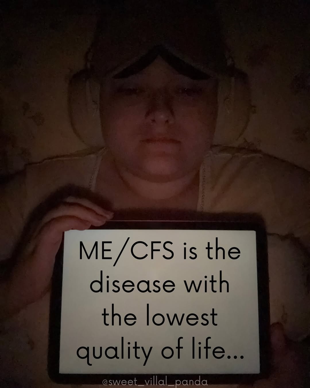 Samantha is holding a sign that reads: ME/CFS is watching life happen to other people while you slowly fade away.
